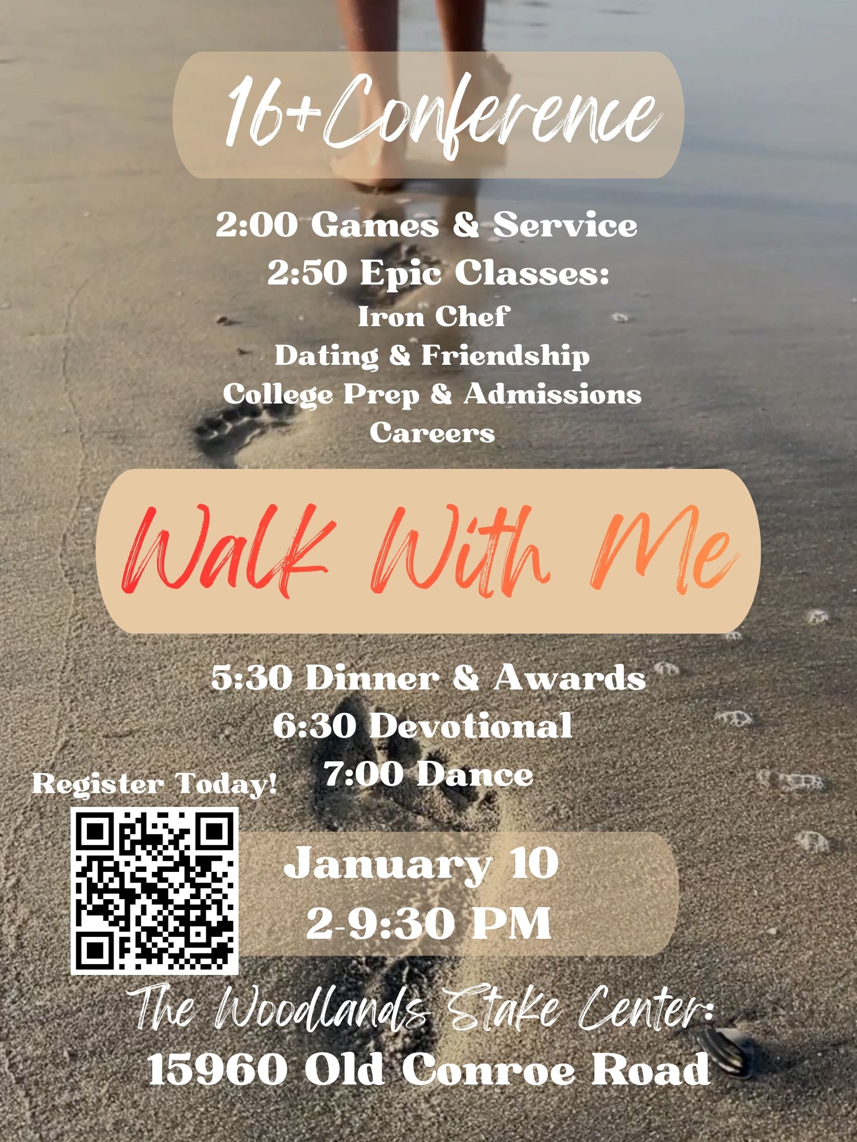 - Saturday, January 10 – "Walk with Me" Quad-Stake 16+ Conference